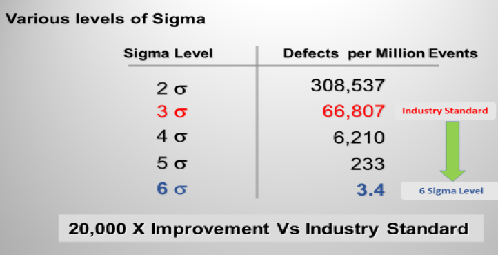On an average, most of the processes in any industry (Manufacturing or Service) are working at 3 –sigma level. Which means, they are producing 66,807 defects* (on an average). This also means that we have to improve the process by 20,000 times to bring it to the 6-Sigma level.