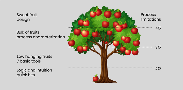 As depicted in the above picture, while it takes only ‘Logic and intuition quick hits’ to bring your process to a 2-sigma level, it takes significant efforts to elevate it to 6-sigma level which includes both the process as well as the data door.